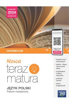 Vademecum „NOWA Teraz matura. Język polski” pozwala powtórzyć treści przedmiotowe oraz zapoznać się ze sposobami rozwiązywania zadań egzaminacyjnych. Realizuje wymagania egzaminacyjne CKE obowiązujące na maturze 2024. komplet wymaganej teorii i wiedzy o lekturach w jednym miejscu dostęp do materiałów cyfrowych, m.in.: quizów i animacji do lektur, fiszek i filmów utrwalających wiedzę o epokach graficzne notatki do uzupełniania krótkie streszczenia lektur w vademecum i obszerne, szczegółowe streszczenia w aplikacji zadania maturalne po każdym dziale planer – plan przygotowań do matury NOWA Teraz matura. I wiesz jak zdać maturę. Dostęp do zasobów cyfrowych jest możliwy po rejestracji w aplikacji app.nowaterazmatura.pl i aktywacji kodu dostępu z publikacji. Kod umożliwia dostęp do materiałów od 1 września do 31 sierpnia następnego roku, niezależnie od dnia aktywacji.