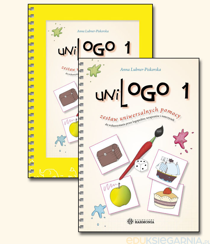Unilogo 1 [Pomoce dydaktyczne] : zestaw uniwersalnych pomocy do wykorzystania przez logopedów, terapeutów i nauczycieli / Anna Lubner-Piskorska. - Wyd. 2 - Gdańsk : "Harmonia", 2013. - Teka (86 k. tabl. luz.) : il. ; 30 cm +książka: 100 s. : il. (w tym kolor.) ; 30 cm.