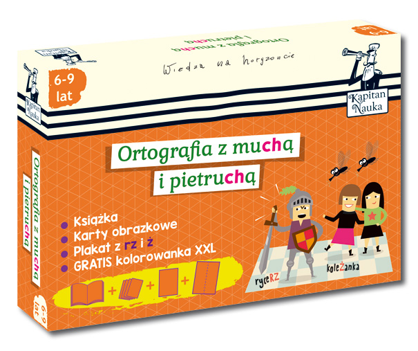akiet Ortografia z muchą i pietruchą to unikalny zestaw zawierający poradnik dla opiekunów, 110 dwustronnych, ilustrowanych kart wzbogacających słownictwo i uczących prawidłowej pisowni języka polskiego, plakat ortograficzny utrwalający pisownię wyrazów z 'rz' i 'ż' oraz kolorowankę ortograficzną XXL (55 x 41 cm). Całość stanowi doskonałe uzupełnienie nauki w pierwszych klasach szkoły podstawowej. Kolorowe, zabawne ilustracje stanowią dodatkową zachętę do samodzielnego zdobywania wiedzy. Pakiet zawiera 100 specjalnie opracowanych kart, dzięki którym dzieci z łatwością przyswajają poprawny sposób pisania aż 100 problematycznych słówek oraz 10 kart specjalnych z zasadami ortografii. Na awersie karty znajduje się słowo z wykropkowanym miejscem do wstawienia brakującej litery wraz z zabawną ilustracją, a na rewersie – odpowiedź w postaci poprawnie zapisanego wyrazu. Umożliwia to natychmiastowe sprawdzenie prawidłowego rozwiązania samodzielnie przez dziecko. Dzięki temu karty uczą ortografii globalnie, poprzez zapamiętywanie całych, poprawnie zapisanych wyrazów, a oryginalne ilustracje ułatwiają kojarzenie i utrwalanie prawidłowej pisowni. Karty świetnie sprawdzą się w domu, w szkole czy w poczekalni. Można zabrać je na spacer lub w podróż – są doskonałym sposobem na naukę i ćwiczenie w każdej wolnej chwili! Poradnik dla opiekunów (28 str.) prezentuje listę słów przyporządkowanych do właściwych zasad pisowni, 21 propozycji gier z kartami i atrakcyjne ćwiczenia ortograficzne oraz dyktanda. Plakat ortograficzny z zabawnymi, kolorowymi ilustracjami pomaga utrwalić najważniejsze zasady pisowni wyrazów z 'rz' i 'ż', a kolorowanka ortograficzna jest atrakcyjnym uzupełnieniem nauki przez zabawę, nie tylko ułatwia zapamiętywanie reguł ortograficznych, lecz także doskonali koordynację wzrokowo-ruchową i grafomotorykę oraz rozwija wyobraźnię. 10 ważnych reguł, których dzieci uczą się z tym zestawem: - ch wymienia się na sz - ch na końcu wyrazów - ó wymienia się na o - ż w zakończeniach -aż, -eż - ż wymienia się na g - rz w nazwach zawodów - rz po spółgłoskach p, b, t, g - u na początku wyrazu - si, zi, ci, dzi, ni przed samogłoskami - ś, ź, ć, dź, ń przed spółgłoskami.