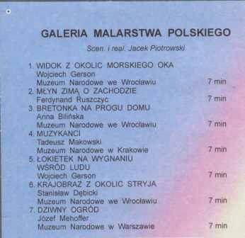 Zawiera: Tytuły audycji TVP: Widok z okolic Morskiego Oka ; Młyn zimą o zachodzie ; Bretonka na progu domu ; Muzykanci ; Łokietek na wygnaniu wśród ludu ; Krajobraz z okolic Stryja ; Dziwny ogród.