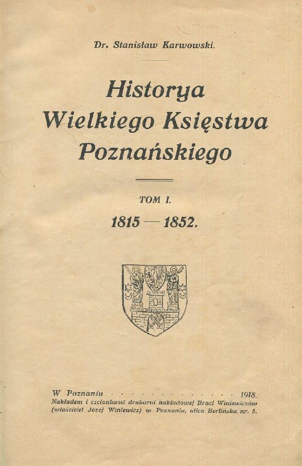 Historya Wielkiego Księstwa Poznańskiego. T. 1, 1815-1852 / Stanisław Karwowski. - Poznań : Drukarnia Nakładowa Braci Winiewiczów (właściciel Józef Winiewicz), 1918 (Poznań : Drukarnia Nakładowa Braci Winiewiczów (właściciel Józef Winiewicz)). - XV, [1], 588, [1] strona, [1] karta tablic : ilustracje ; 24 cm.