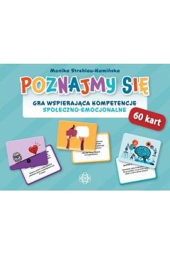 Poznajmy się : gra wspierająca kompetencje społeczno-emocjonalne / Monika Strehlau-Kamińska. - Wydanie I. - Gdańsk : Grupa Wydawnicza Harmonia. Wydawnictwo Harmonia, 2023. - 1 pudełko (48 kart w czterech kategoriach: Jaki jestem?; Co lubię? Co mnie interesuje; Co czuję?; Rozwiązuję problemy ; 12 kart specjalnych ) : ilustracje kolorowe ; 10x14x3 cm instrukcja (4 strony ; 12 cm).