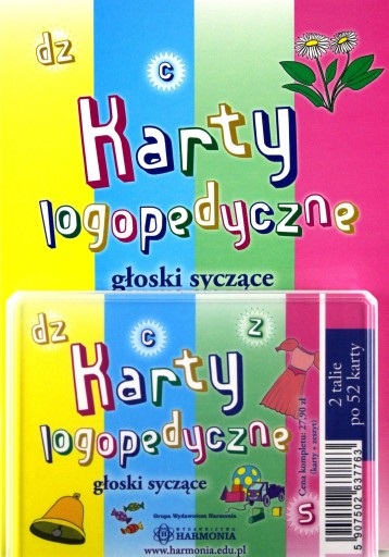 Karty logopedyczne : głoski syczące / [oprac. Magdalena Hinz ; il. Krzysztof Spychał]. - Gdańsk : Wydawnictwo Harmonia, 2011. - Pudełko [2 talie kart po 52 karty] : il. ; 13 cm + książeczka: 15 s. : il. ; 21 cm