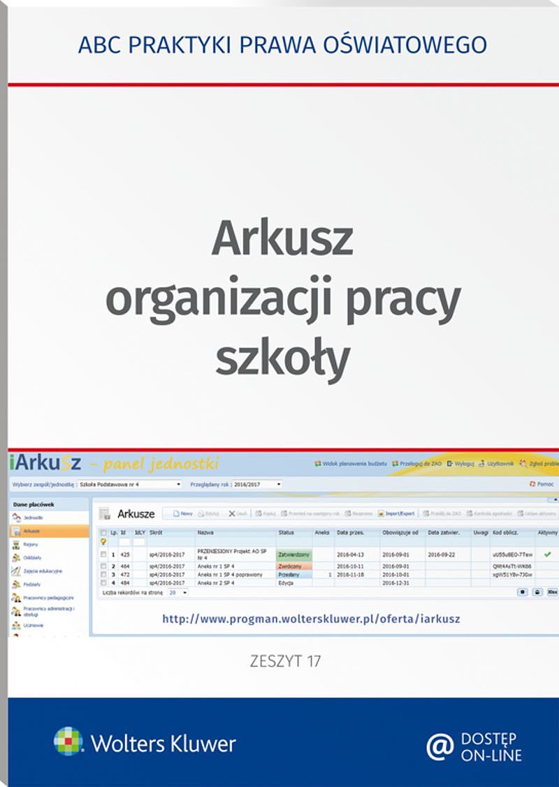 Arkusz organizacji to jeden z podstawowych dokumentów określających zasady funkcjonowania szkoły i placówki oświatowej. Jest opracowywany na dany rok szkolny i zawiera przede wszystkim określenie liczby oddziałów w danej szkole, godzin zajęć oraz przydział tych godzin poszczególnym nauczycielom. Sporządzenie arkusza, począwszy od roku szkolnego 2017/2018 i lata następne różni się od sposobu ustalonego w dotychczasowych regulacjach. W opracowaniu omówiono: - nowe podstawy prawne opracowania arkusza szkoły, - harmonogram opracowania arkusza organizacyjnego, - sposób dokonywania zmian w arkuszu organizacyjnym, - udział zakładowych organizacji związkowych w procesie tworzenia arkusza organizacji szkoły, - udział rady pedagogicznej w opiniowaniu arkusza, - zagadnienia udostępniania arkusza na gruncie ustawy o dostępie do informacji publicznej oraz ochrony danych osobowych. W publikacji przytoczono opinie i wyjaśnienia resortu edukacji oraz organów nadzoru pedagogicznego, a także zawarto odpowiedzi na pytania najczęściej pojawiające się podczas tworzenia arkusza organizacji pracy szkoły.